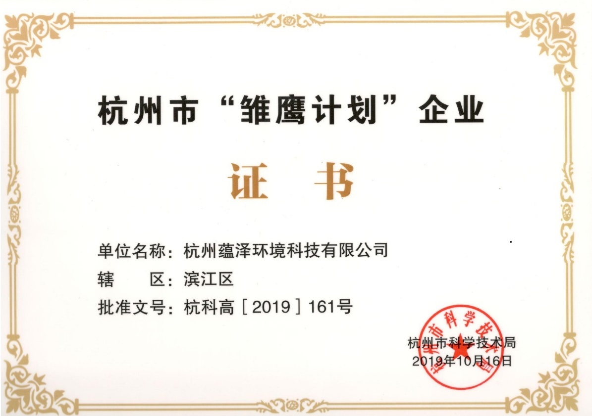 根據2019年10月18日杭州市科學技術局“關于認定2019年杭州市’雛鷹計劃’企業“的通知,杭州蘊澤環境科技有限公司被成功認定為杭州市“雛鷹計劃”企業。近日,公司正式獲得了杭州市“雛鷹計劃”企業證書。