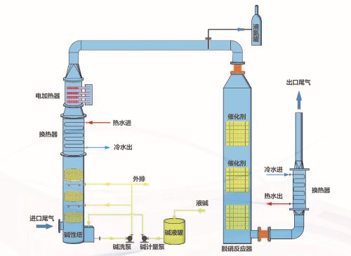 該工藝廢氣排煙溫度低于35℃,在進(jìn)入脫硝反應(yīng)器前先經(jīng)過(guò)堿洗塔清洗,去除工藝廢氣中含有的少量HCl等酸性氣體,后進(jìn)入加熱器升溫至合適溫度。一段加熱利用脫硝后的尾氣進(jìn)行換熱,熱媒采用除鹽水;二段加熱采用電加熱器。最終達(dá)到低溫催化劑的理想溫度范圍:100~150℃。經(jīng)加熱后的工藝廢氣進(jìn)入脫硝反應(yīng)器發(fā)生還原反應(yīng),生成氮?dú)夂退?/span>